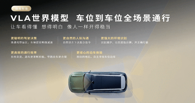 新车采用VLA世界模型方案,具备高速NOA与城区NOA功能同时具支持车位到车位全场景通行,为用户提供全方位的智能驾驶保障。