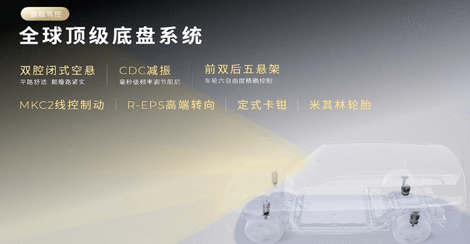 底盘方面,新车搭载双腔闭式空悬和CDC减振,前双后五的悬架结构。LMC2.0底盘运动融合控制系统,圆规掉头、零动掉头等功能轻松实现,还有路面预瞄系统,带来“凌波微步”般的驾乘体验。