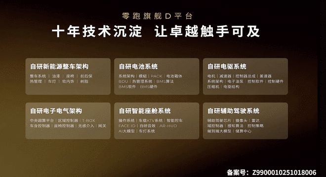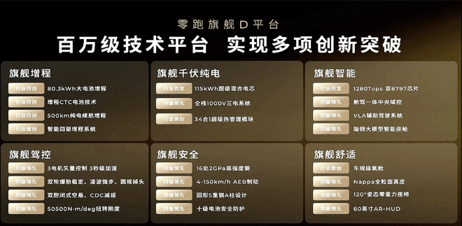 零跑旗舰D平台,在整车架构和电池、电驱、电气架构、智能座舱、辅助驾驶系统上都采用全域自研的技术实力,做到了技术领先和成本可控。
