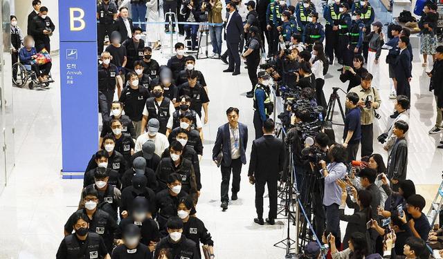 当地时间10月18日,一批在柬埔寨涉嫌参与网络诈骗被拘留的韩国籍嫌疑人被柬方遣返后,抵达仁川国际机场。图源:韩媒