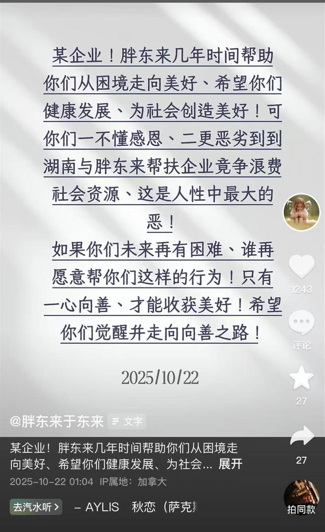 于东来原文:某企业!胖东来几年时间帮助你们从困境走向美好、希望你们健康发展、为社会创造美好!可你们一不懂感恩、二更恶劣到到湖南与胖东来帮扶企业竞争浪费社会资源、这是人性中最大的恶!如果你们未来再有困难、谁再愿意帮你们这样的行为!只有一心向善、才能收获美好!希望你们觉醒并走向向善之路!