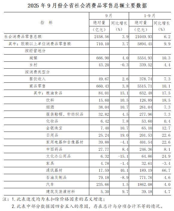 2025年9月份,河南社会消费品零售总额2458.56亿元,同比增长3.9%。其中,限额以上单位消费品零售额710.10亿元,增长3.7%。