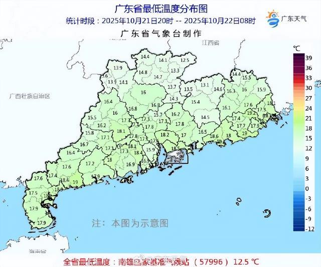 根据广东省气象部门监测,截至22日早晨,广东大部气温继续走低,其中南雄国家基准气候站录得12.5℃低温,为22日早晨广东范围内国家基本气象站当中的最低气温。在广州,广州国家基本气象站22日早晨录得最低气温16.7℃,为今年下半年以来该站所录得的最低气温。