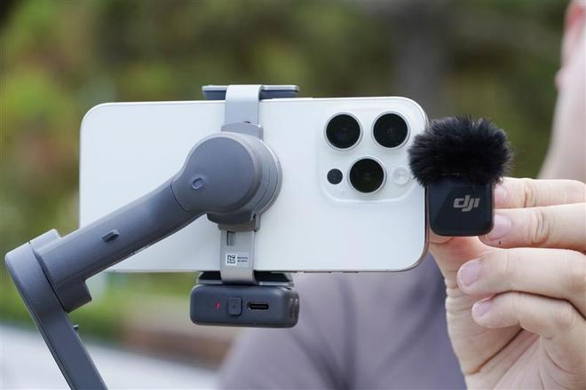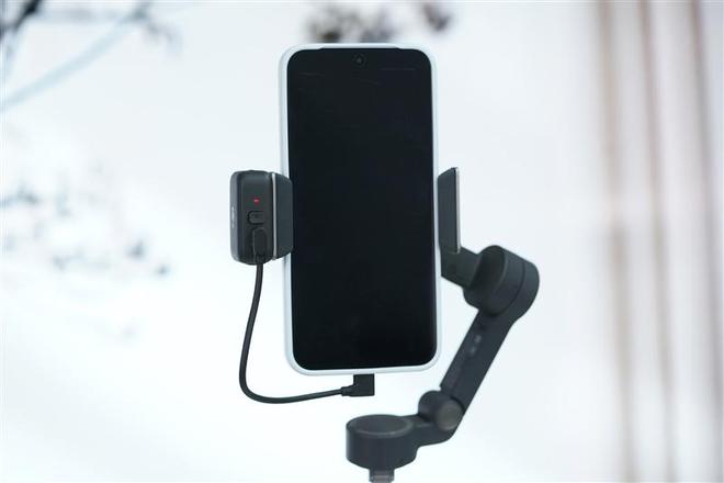 这个多功能追踪模块还继承了无线麦接收器的功能,配和小巧的大疆Mic Mini,只需要极少的成本,就可以获得专业级的收音效果。毕竟手机的麦克风设计都是为了通话质量,是面向屏幕的近场收音,拍摄V-Log时的远场收音效果不佳。