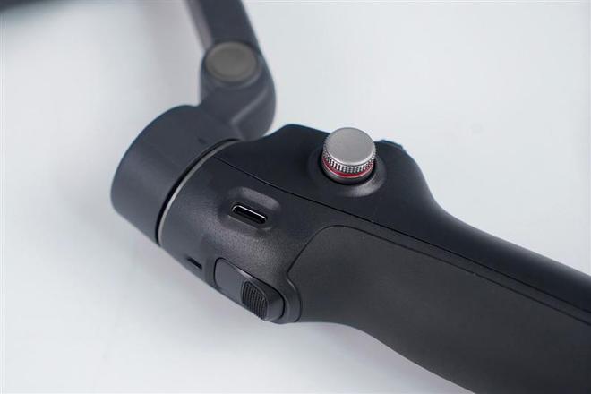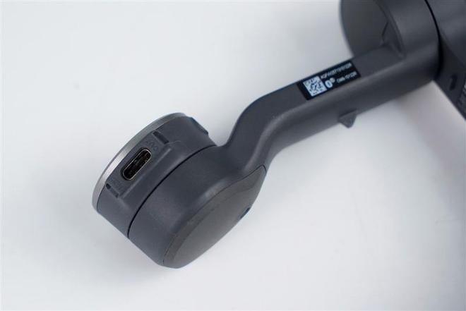 大疆Omso Mobile 8手柄侧面的充电接口,也可以看到扳机键表面十分明显的防滑纹理,拿在手里食指可以非常自然的找到扳机键的位置。