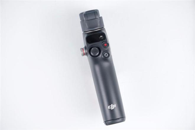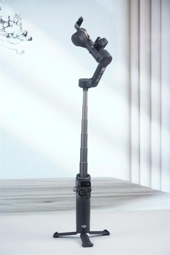 大疆Omso Mobile 8手柄上面有延长杆,下面有三脚架,很难想象可以续航10小时的电池都藏在哪儿了。