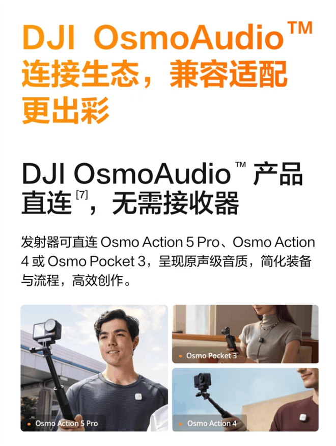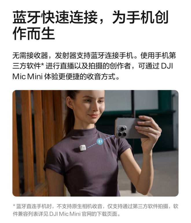 大疆Mic Mini可以直连自家的Action 4/5 Pro或者Osmo Pocket 3,无需接收器,更加方便,对于手机来说也可以直连,虽然只有一些第三方程序才可以直接支持收音,但依旧可以让普通用户的使用成本大幅下降。