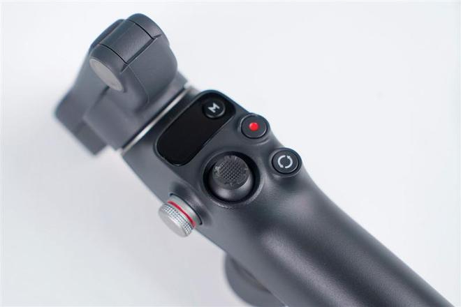 大疆Omso Mobile 8手柄正面特写,手柄上集成了一个小屏幕和三个按钮,一个摇杆和一个拨轮,用大拇指可以非常舒服的控制,背面还有一个食指控制的扳机键,单手操作毫无压力。