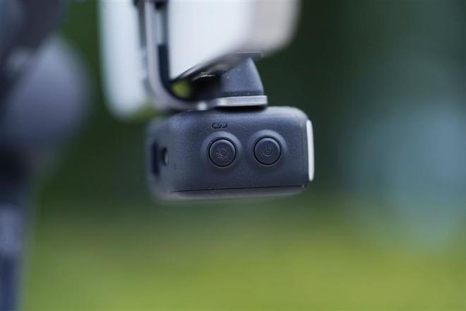 大疆DJI Osmo Mobile 8标配的多功能追踪模块,既然叫多功能,自然是还集成了其他功能,除了显而易见的补光灯之外,它还集成了大疆无线麦克接收器的功能,正好可以和我们这个单独的大疆Mic Mini发射端配对,组合工作,取代手机本身自带麦克的收音。