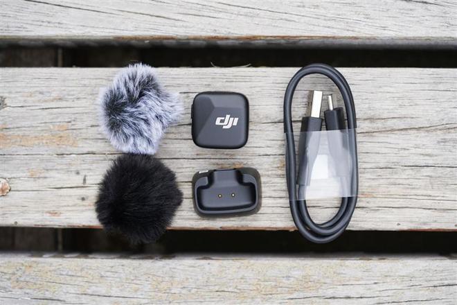 大疆Mic Mini附件一览,一条充电先一个充电底座,黑色和灰色两个防风毛衣,和USB充电线对比可以看出大疆Mic Mini本体确实非常的迷你。