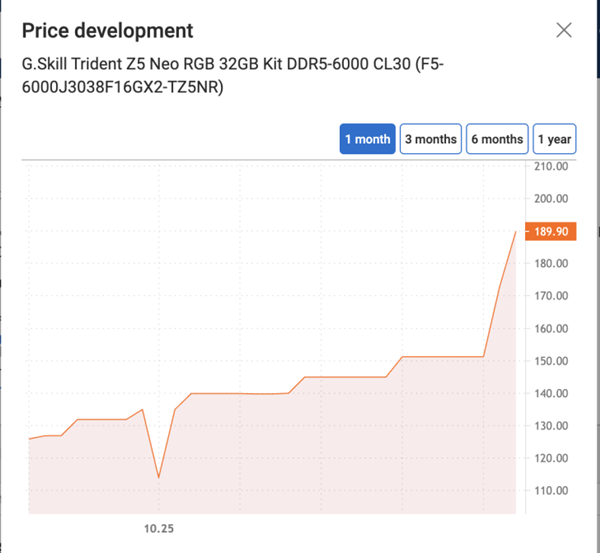 零售市场的形势也大致相同,以G.Skill Trident Z5 Neo为例,其价格在一个月内上涨了40%,在Idealo.de上达到了189.90欧元历史最高点,这种趋势预计将在未来几个季度持续下去。