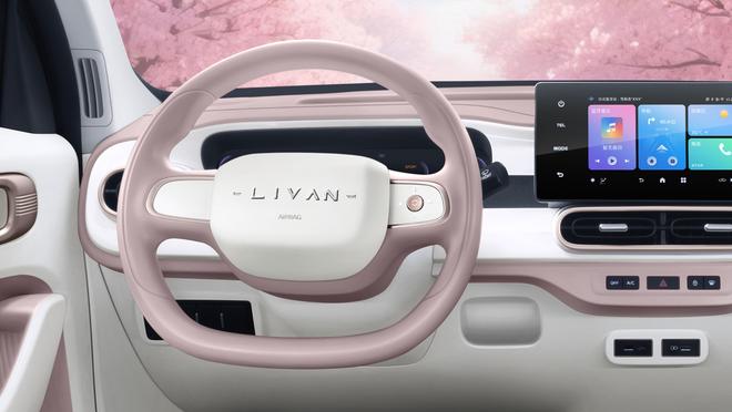 新车采用封闭式前脸,前脸处的窄条幅前格栅,搭配圆形大灯,萌感十足,复古造型的保险杠,采用银色配色,个性十足。充电口巧妙藏在两个大灯中间,充电盖板上印有“LIVAN”的品牌标识。
