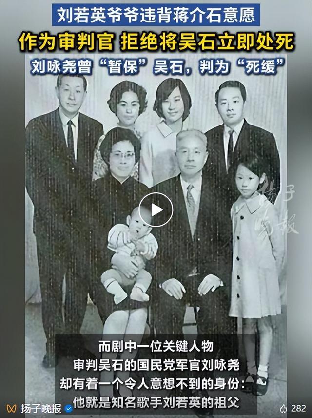 近日,央视大剧《沉默的荣耀》热播。剧中,吴石因身份暴露而被俘。演员@艾东A 饰演的审判官刘咏尧,其角色原型是歌手@刘若英 的祖父。在审判中,蒋鼎文、韩德勤和刘咏尧三位审判官,并未完全顺从蒋介石立即处死吴石的意图,而是判处了“死缓”。不幸的是,刘咏尧最终还是未能保住吴石,吴石等人仍旧被蒋介石处以死刑。