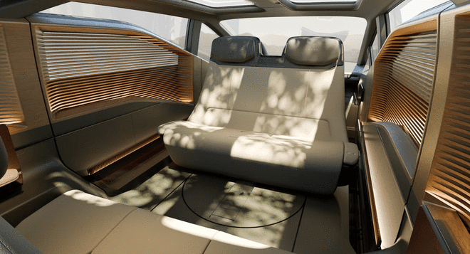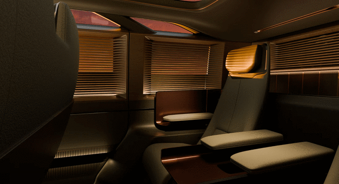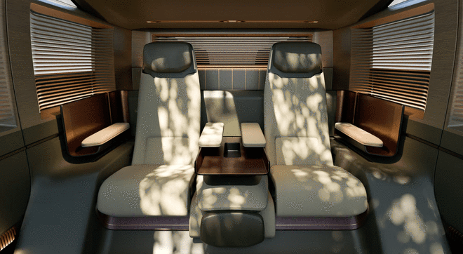 车内的重点显然是在乘坐体验上,前排座椅可以向后旋转,与二排座椅形成独立的会客空间。二排拥有宽敞和独立的私密空间,装饰典雅,配备了大面积的竹帘,像坐在茶室而非车内。