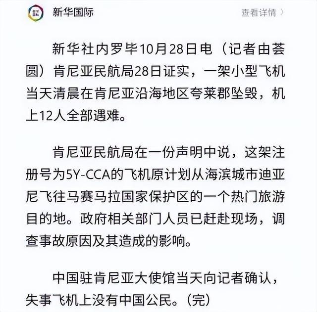 肯尼亚民航局在一份声明中说,这架注册号为5Y-CCA的飞机原计划从海滨城市迪亚尼飞往马赛马拉国家保护区的一个热门旅游目的地。政府相关部门人员已赶赴现场,调查事故原因及其造成的影响。
