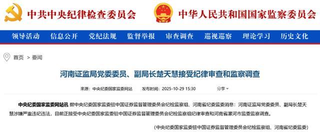 10月29日,中央纪委国家监委网站通报,据中央纪委国家监委驻中国证券监督管理委员会纪检监察组、河南省纪委监委消息:河南证监局党委委员、副局长楚天慧涉嫌严重违纪违法,目前正接受中央纪委国家监委驻中国证券监督管理委员会纪检监察组纪律审查和河南省漯河市监委监察调查。