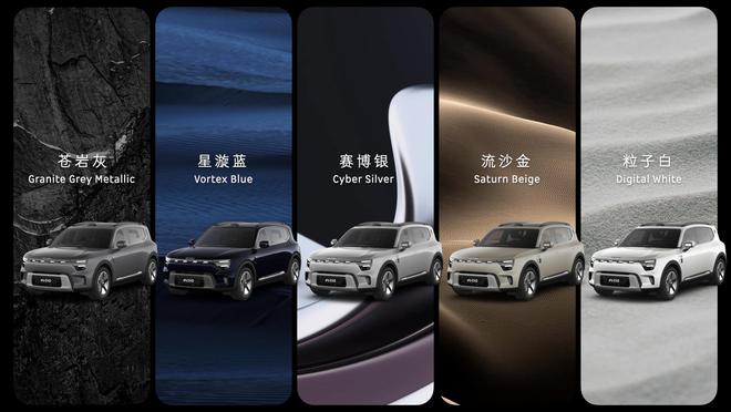 新车提供 星漩蓝、苍岩灰、流沙金、粒子白、赛博银5款车身颜色~