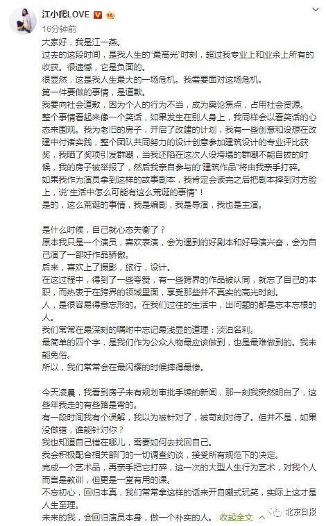 江一燕随后发文致歉,称自己会积极配合相关部门的一切调查约谈,接受所有规范下的决定。
