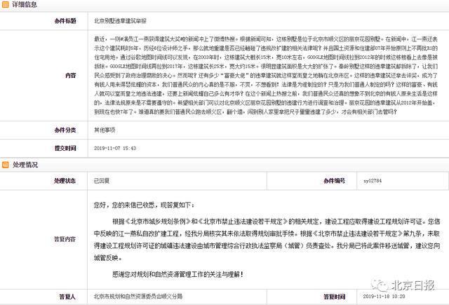 对此,北京市规划自然资源委顺义分局回应称,该涉事别墅经核实未依法取得规划审批手续,已移交城管部门处理。