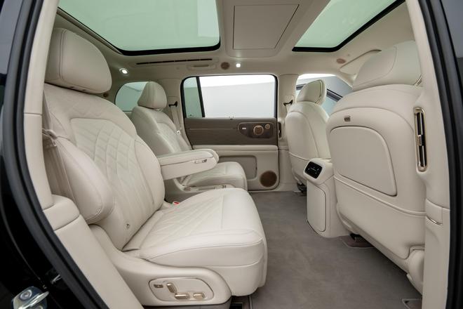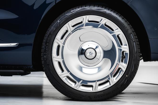车身侧面,也是方方正正的设计。内凹式的腹线和贯穿式的肩线,更显气场。侧窗下方为银色镀铬条装饰,搭配悬浮式车顶和隐藏式门把手,显得高大威猛。轮毂为圆饼式造型,共提供20英寸、21英寸、22英寸三种轮毂尺寸。
