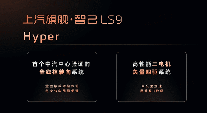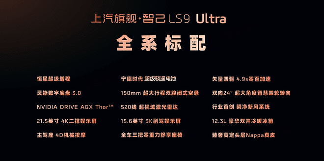 新车是上汽近十年技术创新的集大成者,搭载恒星超级增程,拥有402kmCLTC纯电续航里程、2.81L/100km的油电综合折算能耗、全系4秒级零百加速。驾控方面,新车搭载灵蜥数字底盘3.0,采用双向24°超大角度智慧四轮转向系统,官方称其为“最好开的9系”。同时,智己LS9全系标配520线激光雷达和英伟达ThorU芯片,感知能力强大。此外,新车还搭载了IMAIOS智能座舱、丹麦B&O音响、4D机械按摩座椅等配置,预计在11月12日正式上市。