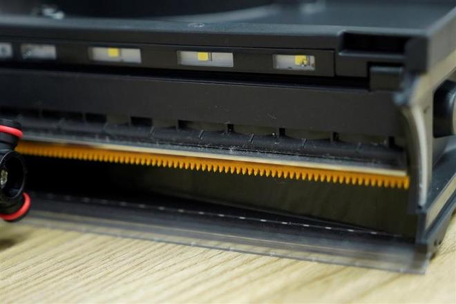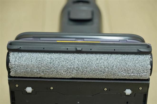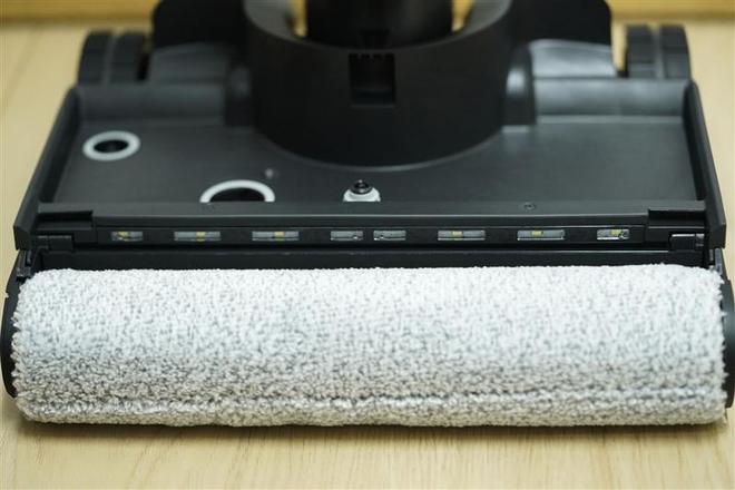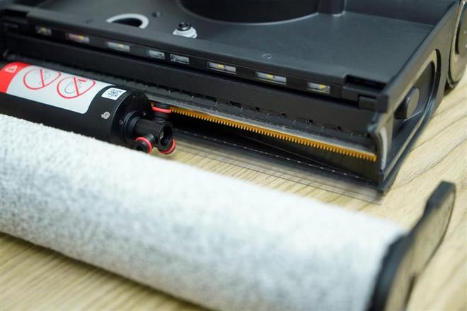正面的滚刷,宽度几乎和洗地机相同,清洁时很方便贴边。滚刷后方一排LED灯珠,通过水箱内的导光设计,对洗地机前方地面进行立体照明。