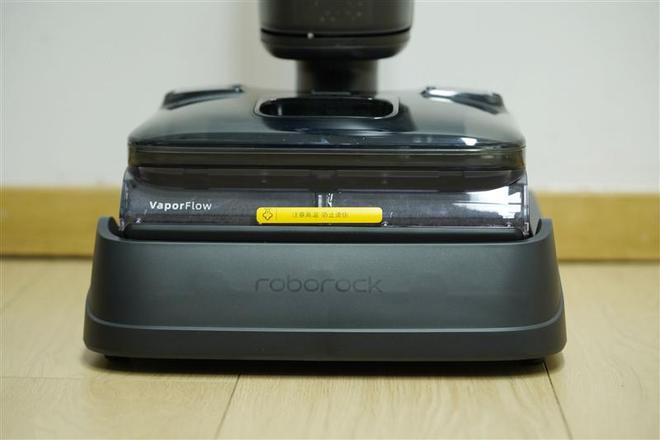 洗地机正面的VaporFlow标识和黄色的防烫警告贴纸,表明了石头洗地机A30 Pro Steam智享版洗地机的最大特色,高压高温蒸汽。