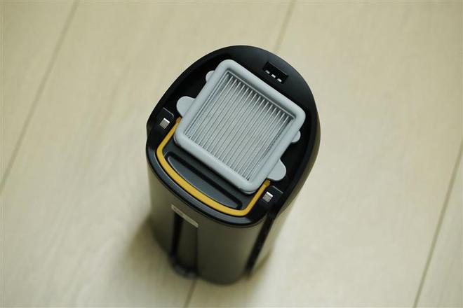 取下后可以看到污水箱上方的空气滤芯,向上拉起橘黄的拉手,即可抽出内部结构,方便倾倒污水和垃圾并清洁内部。