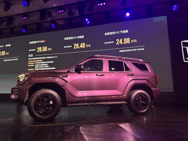 11月6日报道全新坦克400正式上市,推出Hi4-Z和Hi4-T两个智享版,售价分别为31.98万元和29.98万元。同时,为了满足用户的需求,官方继续推出全新坦克400Hi4-T普遍版价格为28.58万,同时还有全新坦克400柴油版和汽油版,价格分别是26.98万和24.98万元。此次,全新坦克400首次搭载了Hi4-Z架构,采用2.0T发动机与前后双电机组合,系统综合功率达到635kW,峰值扭矩高达1195N·m,零百加速仅需4.3秒。至此,全新坦克400将提供Hi4-Z、Hi4-T、汽油、柴油四大动力,是唯一覆盖全动力矩阵的越野SUV,为用户全场景出行需求提供多种选择。