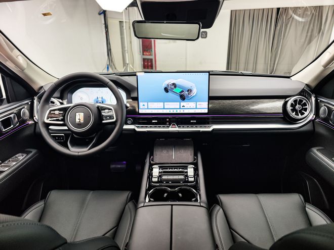 座舱配备长城汽车第三代智慧空间系统Coffee OS 3.3版本,集成Coffee GPT语音大模型,支持毫秒级响应与模糊指令识别。五屏协同系统包括12.3英寸仪表屏、15.6英寸2.5K中控巨幕、HUD抬头显示、9.2英寸流媒体后视镜和15.6英寸后排吸顶娱乐屏,信息可无缝流转。