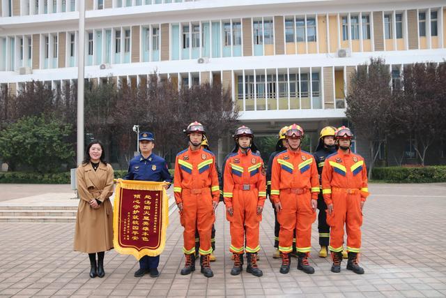 刘洋校长代表全体师生向消防救援站赠送锦旗,感谢消防员的细致教学与安全守护,更凝聚起“社校联动护安全,协同共育伴成长”的同心力量。