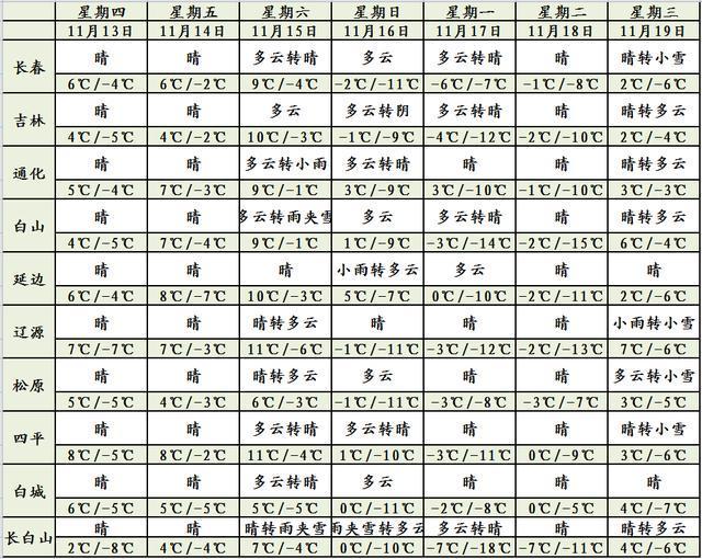 12日夜间到13日白天,全省多云,通化南部、白山、长白山保护开发区有小雨或雨夹雪转小雪。