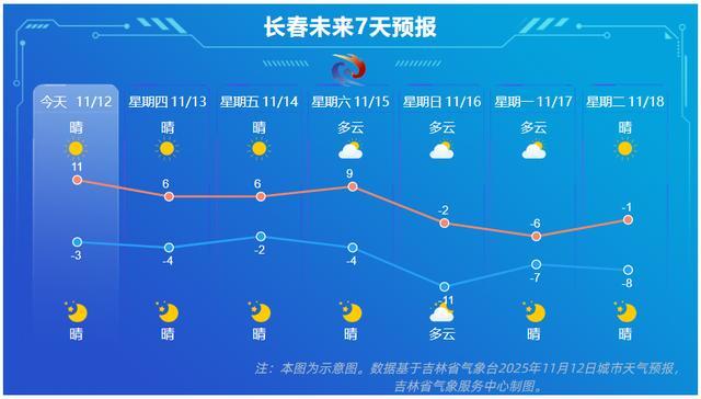 今天夜间到明天白天,最低气温:全省大部-5~-2℃,最高气温:全省大部4~8℃;长春市最低气温:-3℃,最高气温:6℃。