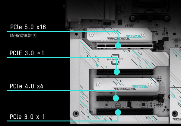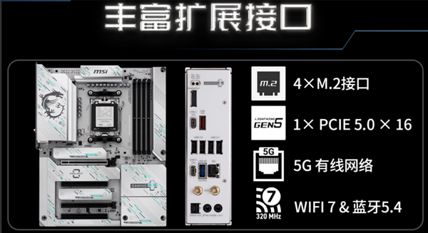 插槽提供PCIe 5.0 x16显卡插槽、3组M.2接口(含Gen5 x4 128Gbps)、4个SATA 6Gbps接口,覆盖冰霜铠甲散热,同时配备Wi-Fi 7与5G有线网卡。