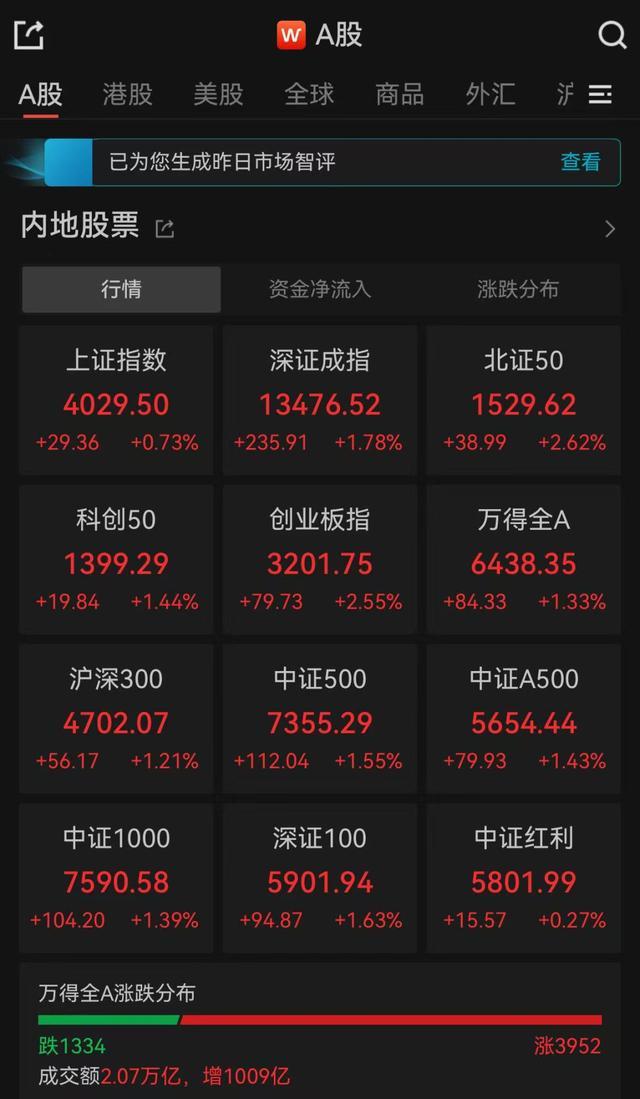 13日,A股三大指数低开高走。Wind数据显示,沪指盘中最高达4030.40点,再创十年新高。截至收盘,沪指报4029.50点,涨0.73%,深证成指涨1.78%,创业板指涨2.55%。