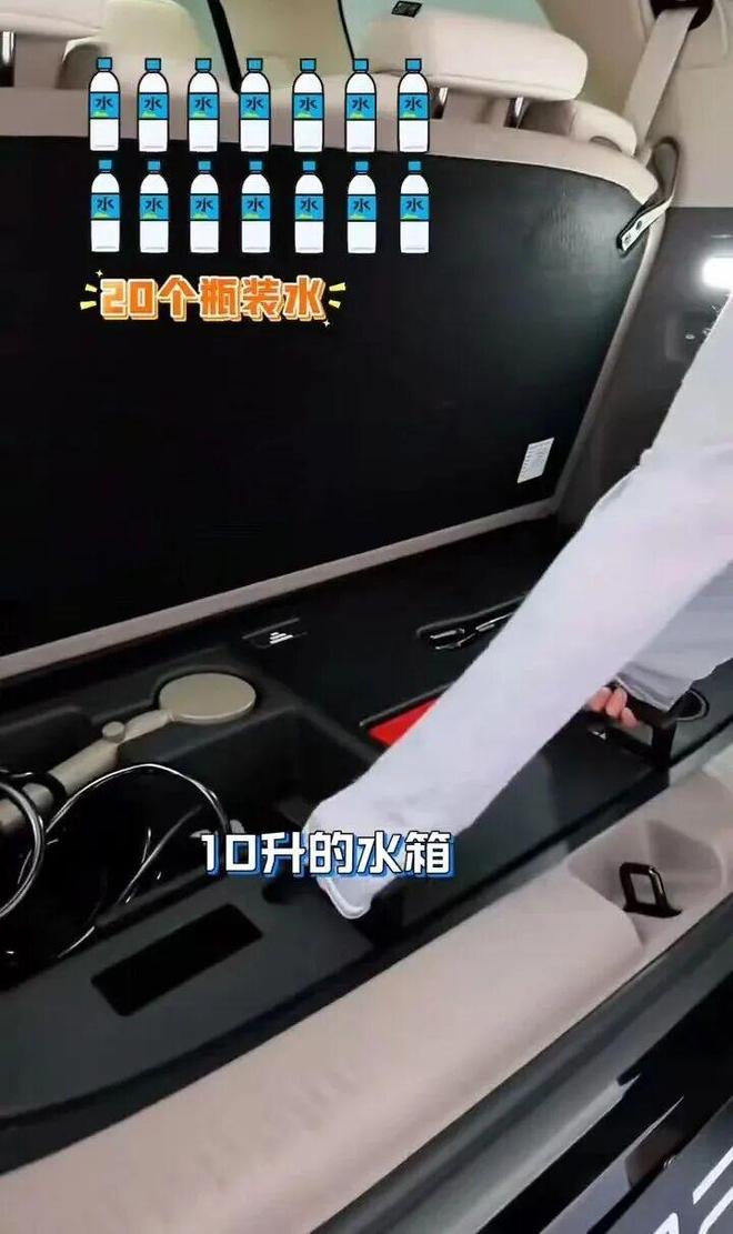 车辆后备箱下方的暗格处,隐藏着一个能够容纳10升水的水箱。同时配有一个淋雨花洒头以及加热系统。