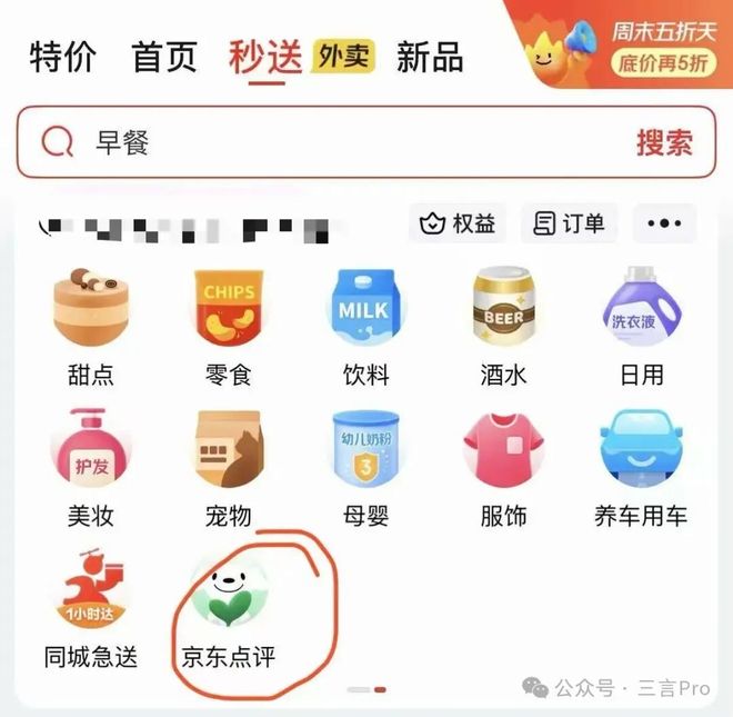 三言发现,近日京东在秒送里上线了“京东点评”功能,目前入口藏的还有点深。新板块包含五个频道:找美食、住酒店、挑好物、去哪玩、选家政。