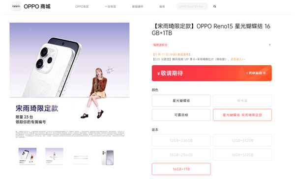 据了解,OPPO Reno15宋雨琦限定款也将同步发布,配色为星光蝴蝶结,提供16GB+1TB版本。