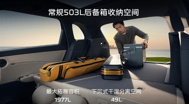 三幅式方向盘采用双色搭配,前方的液晶仪表盘尺寸适中,显示信息丰富,该车还搭载有30寸的AR-HUD显示屏,驾驶信息获取更加轻松便捷。内饰提供有四种内饰颜色,分别为墨石黑、芳华红、秋实橙和林雪白。该车拥有31处储物空间,后备厢标准容积503L,最大可拓展至1977L,在后备厢下部,还有49L干湿分离的储物空间。