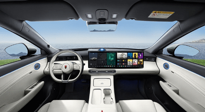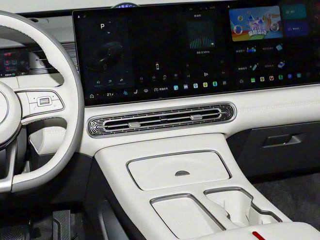 内饰设计典雅科技,中控及副驾双联屏十分显眼,可以提供丰富的显示及娱乐内容。该车搭载了灵犀座舱,采用高通8295P芯片,可流畅支持四平联动不卡顿,并完美支持苹果carplay、华为Hicar等互联系统。