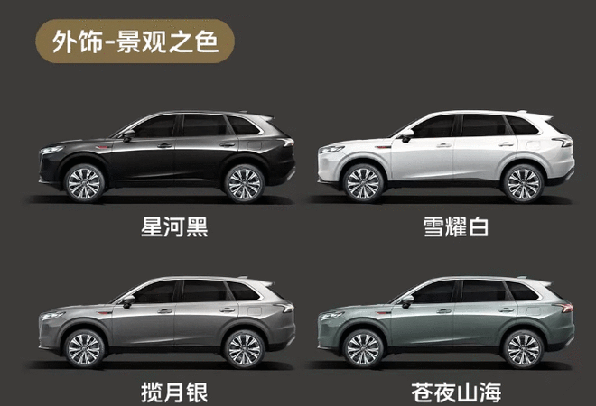 车尾造型简洁明快,凤翎尾尾灯采用锐利切面晶体与渐变灯带相融合的设计、光影效果出色。此次新车提供有四种外观颜色,分别为星河黑、雪耀白、揽月银及苍夜山海。
