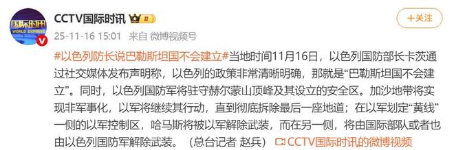当地时间11月16日,以色列国防部长卡茨通过社交媒体发布声明称,以色列的政策非常清晰明确,那就是“巴勒斯坦国不会建立”。同时,以色列国防军将驻守赫尔蒙山顶峰及其设立的安全区。加沙地带将实现非军事化,以军将继续其行动,直到彻底拆除最后一座地道;在以军划定“黄线”一侧的以军控制区,哈马斯将被以军解除武装,而在另一侧,将由国际部队或者也由以色列国防军解除武装。