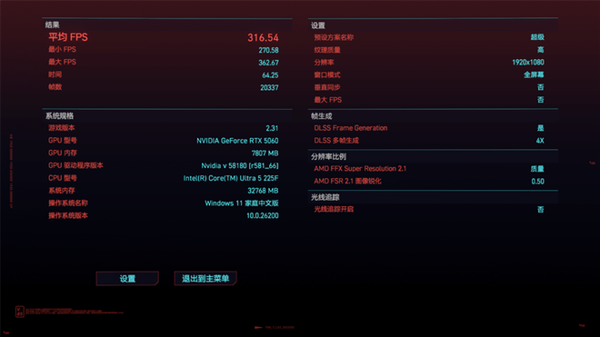 在《赛博朋克:2077》游戏中,我们使用1080P分辨率和超级画质,并开启DLSS 4,对华硕天选6X台式机进行测试,帧率为316.54。