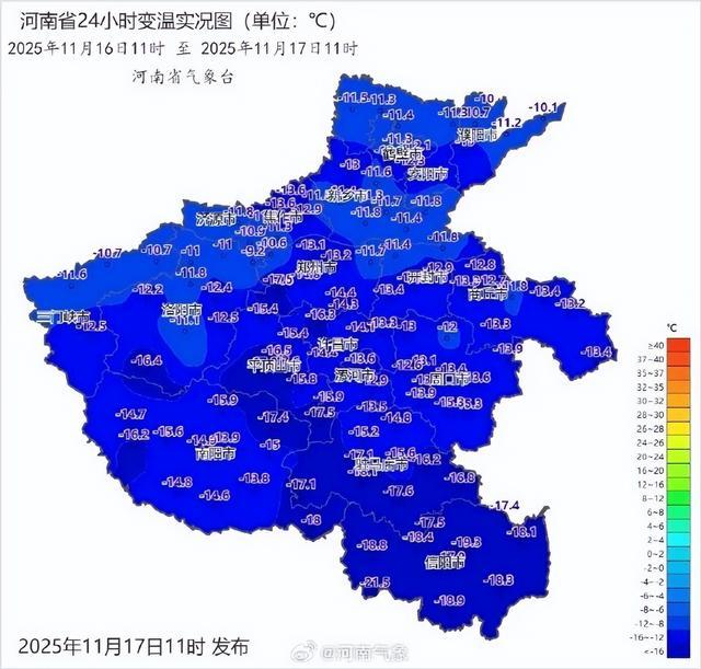 相比昨天同一时刻(11点),全省气温下降超10℃,多地下降超15℃。