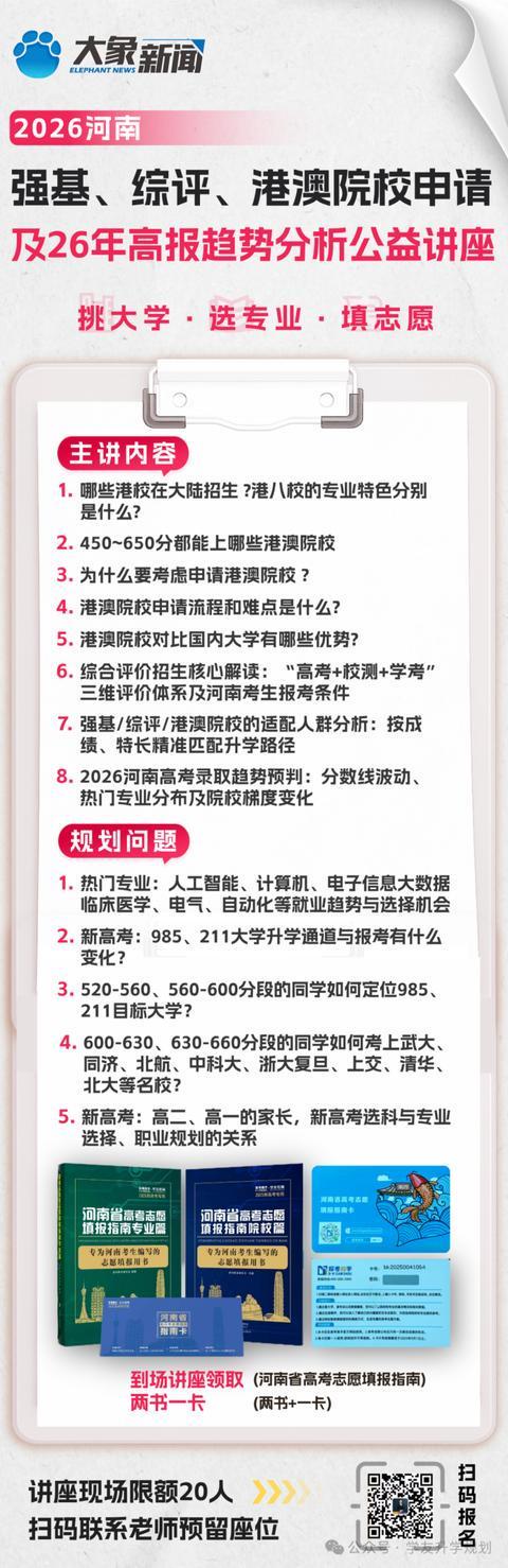 本次公益讲座将围绕“强基、综评、港澳院校申请及26年高考报名趋势分析”展开,讲座将详细解读高考报名流程及趋势,帮助学生和家长了解最新政策,同时针对港澳院校申请进行深入剖析,提供实用建议,还将探讨综合评价招生政策及其影响,助力学生科学规划升学路径,讲座内容丰富,旨在为广大学子和家长提供有价值的参考和指导。