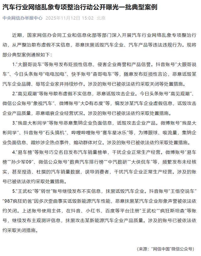 此前,中央网信办在《汽车行业网络乱象专项整治行动公开曝光一批典型案例》中就明确指出,抖音账号“王悟空说车”“987疯狂奶爸”因多次歪曲事实诋毁新能源汽车性能、恶意抹黑汽车企业形象声誉,被依法依约关闭。