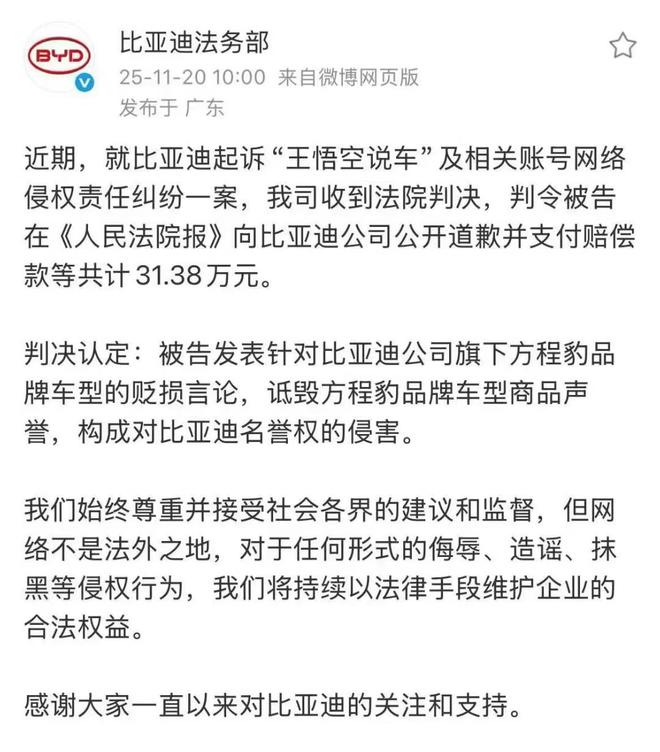 今日比亚迪法务部发文,近期,就比亚迪起诉“王悟空说车”及相关账号网络侵权责任纠纷一案,收到法院判决,判令被告在《人民法院报》向比亚迪公司公开道歉并支付赔偿款等共计 31.38 万元。