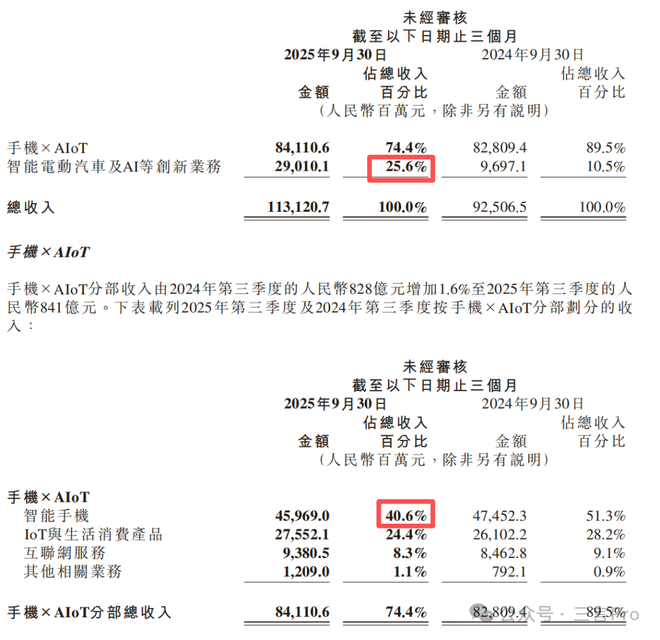 小米的营收在财报主要分两大块,一个是手机×AIoT,另一个是智能电动汽车及AI等创新业务。