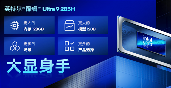 针对万元价位以上价位段的发烧友、开发者市场,Intel推荐采用酷睿Ultra 9 285H处理器搭配96GB或128GB内存,带来更强的AI算力。