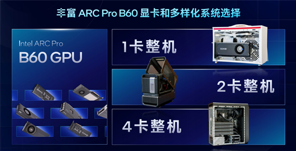 另外,针对有着更高需求的专业用户、中小企业、工作室,Intel最近还推出了锐炫Pro B60专业显卡,搭配酷睿Ultra或者至强W处理器,可组成更强大的工作站,支持单卡、双卡、四卡、八卡甚至是多块双芯卡的不同组合,还可以搭配Gaudi AI加速器。